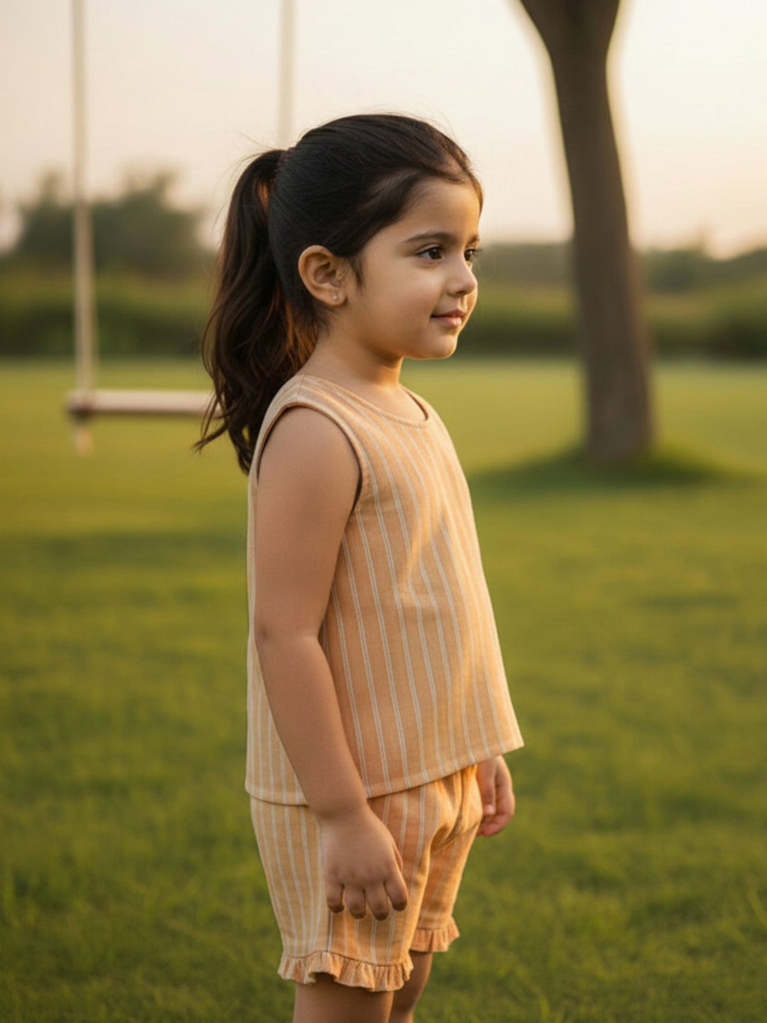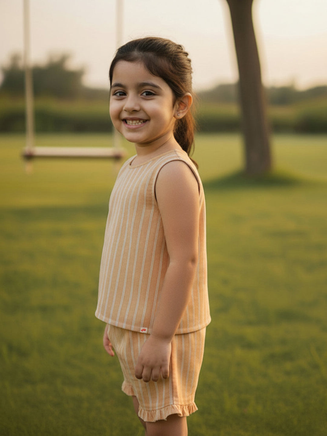 Beige striped sleeveless boxy-fit top and shorts set with cute frill detailing, perfect for a stylish yet comfortable look