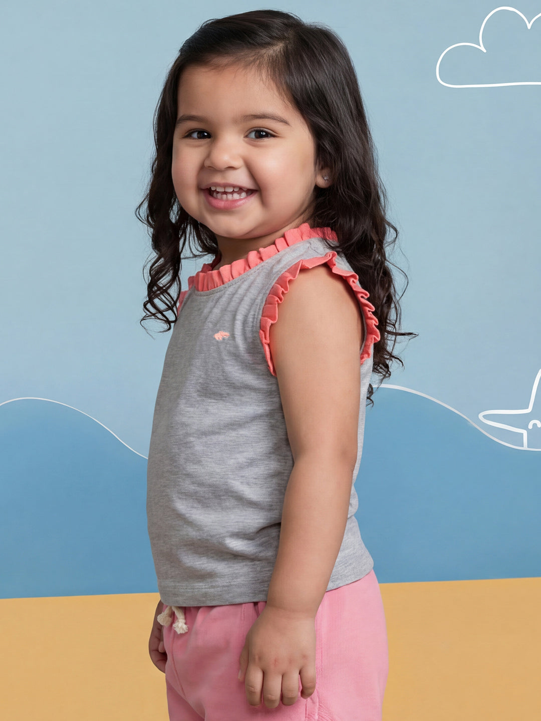 Grey mélange sleeveless t-shirt with cute frill detailing and our embroidered signature logo, offering all-day comfort with effortless style